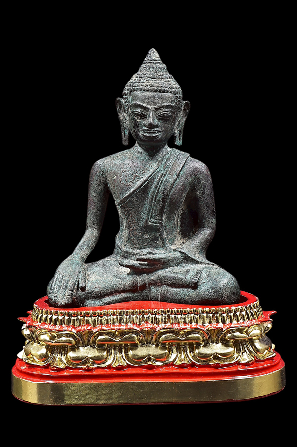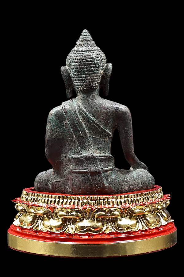 พระพุทธรูปบูชาอู่ทองสุวรรณภูมิ ประทับนั่งขัดสมาธิราบปางมารวิชัย หน้าตัก 5 นิ้ว สูง 7 นิ้ว ไม่รวมฐานพระไม้ เทหล่อแบบไม่มีฐานเพราะเห็นฝาพระบาตรซ้ายคว่ำลง พระอุษณีษะหรือปุ่มนูนบนศรีษะเป็นทรงฝาละมีจัดเป็นพระอู่ทองรุ่นที่ 1 ที่รับอิทธิพลจากขอมลพบุรี เป็นพระพุทธรูปก่อนการสถาปนาสร้างกรุงศรีอยุธยา อายุราว 7-800 ปี มักพบพระพุทธรูปแบบนี้ในจังหวัดชัยนาท ลพบุรี และ สุพรรณบุรี