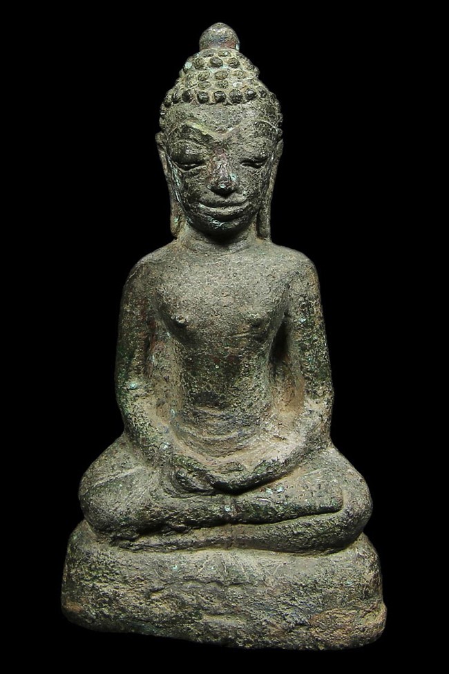 หน้าตัก 2 นิ้ว สูง 4 นิ้ว เนื้อโลหะสำริดสนิมเขียวหยกปกคลุมทั้งองค์ ศิลปะยุคแรกที่สร้างในบ้านเรานี้เรียกว่า