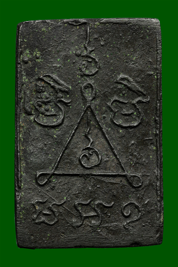 ด้านหลัง: มักปรากฏอักขระยันต์ เช่น ยันต์สาม หรือ ยันต์สี่